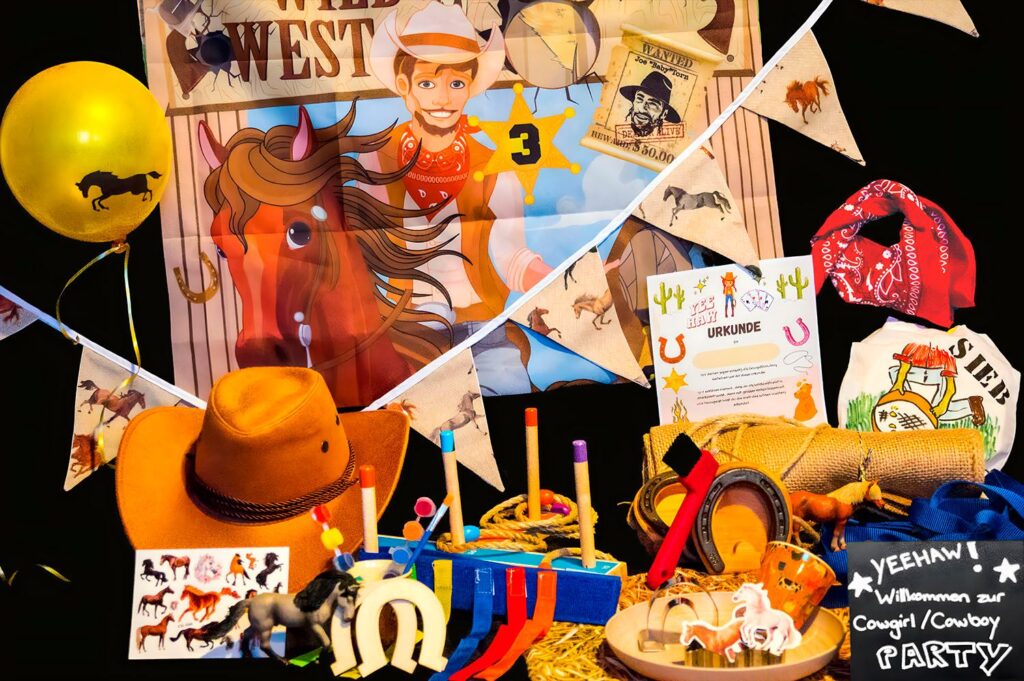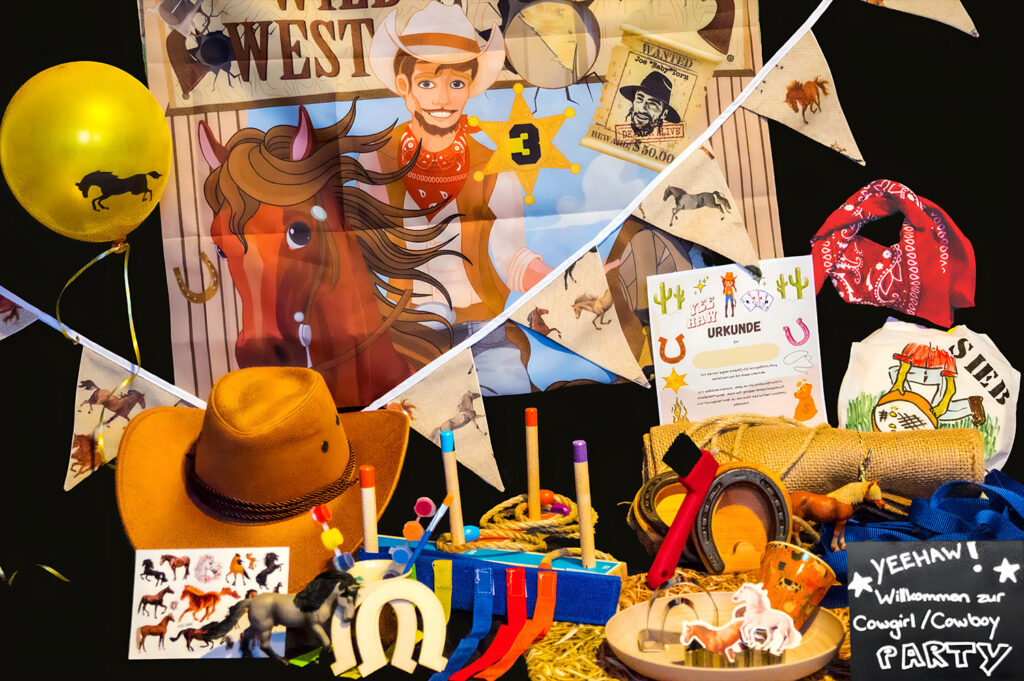 - Spielutensilien: „Schnapp den Schweif“ lustiges Fangenspiel, Hufeisenstelzen mit Hufauskratzer, Sackhüpfen, Cowgirl/Cowboy Wurf-Spiel (ebenfalls als Dekohintergrund zu verwenden), Lasso-Wurfspiel, Eierlauf, Pylonen für Parcours, Sieb zum Gold waschen und Goldnuggets