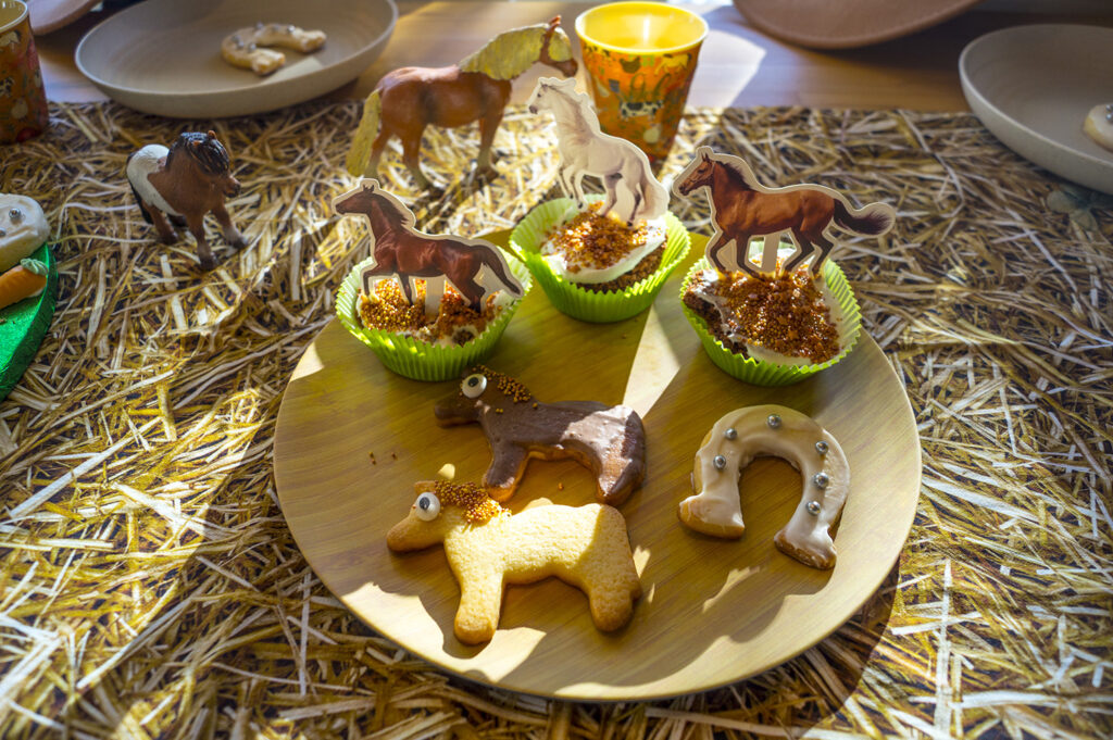 - Backutensilien: Muffin-Picker im Pferdemotiv, Keksausstecher passend zum Motto, Kuchenkerzen