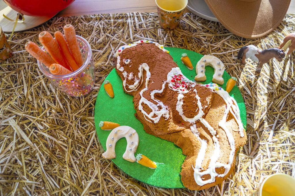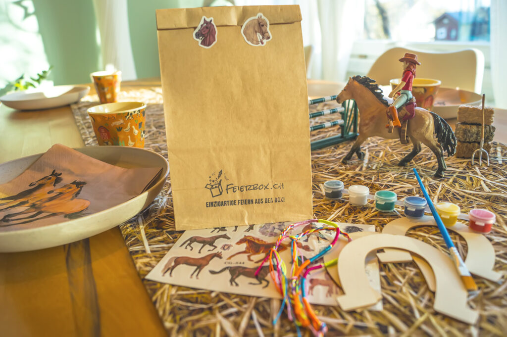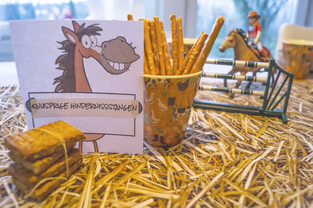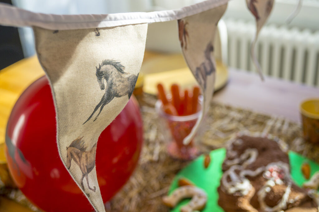 - Deko: Tischläufer in Stroh oder Heu-Optik, Luftballons mit Pferdemotiv, Kunststoff-Pferdefiguren und Heuballen, Deko-Hufeisen, Pferde-Stoff-Wimpelkette, Holzplatten für den Tisch, Servietten, Tischglocke, kleine Schiefertafel zum individuellen Beschriften inkl. Kreidetafelstift