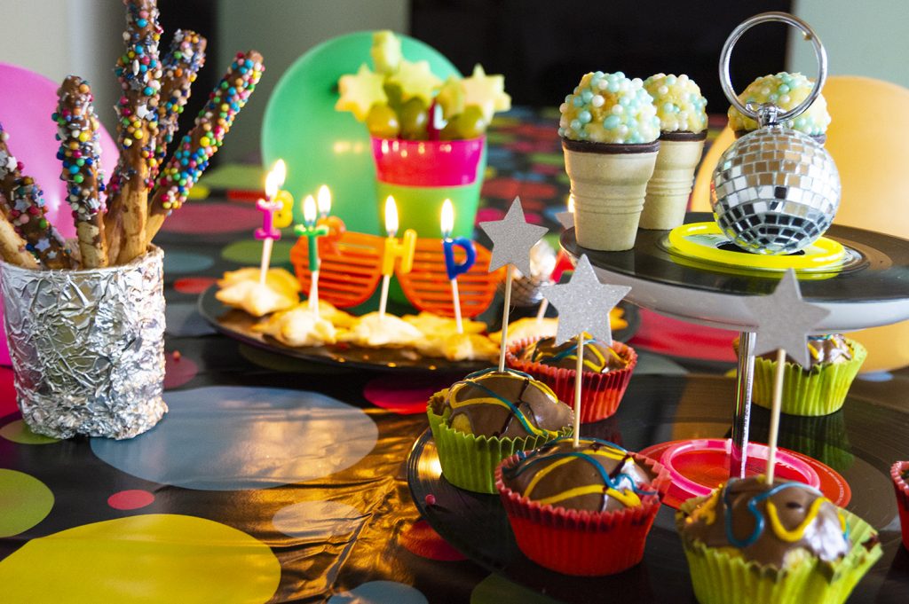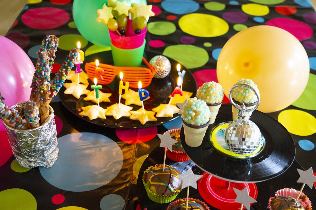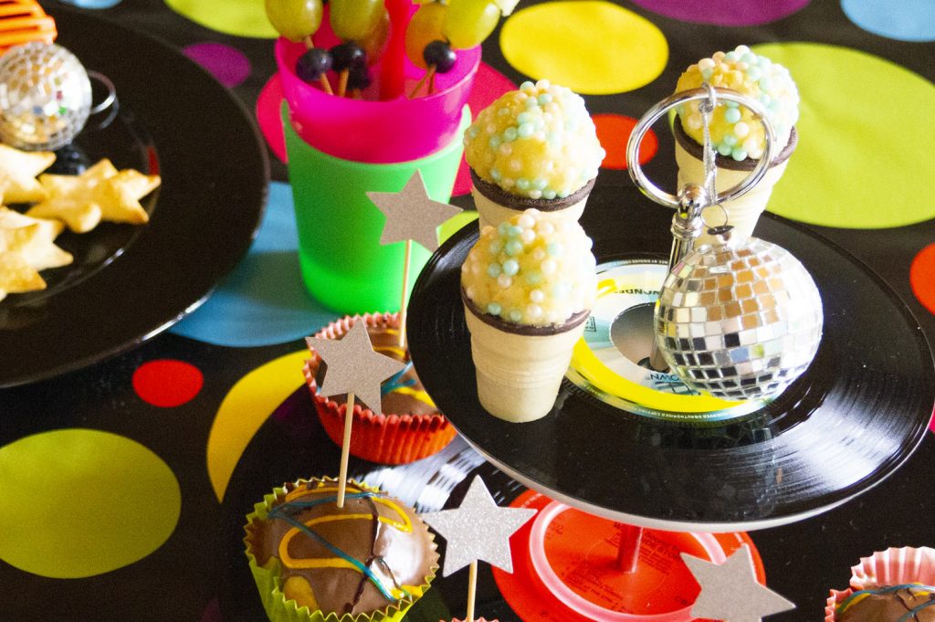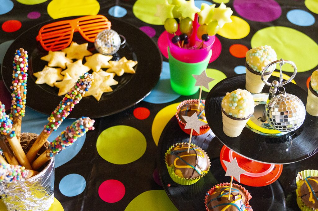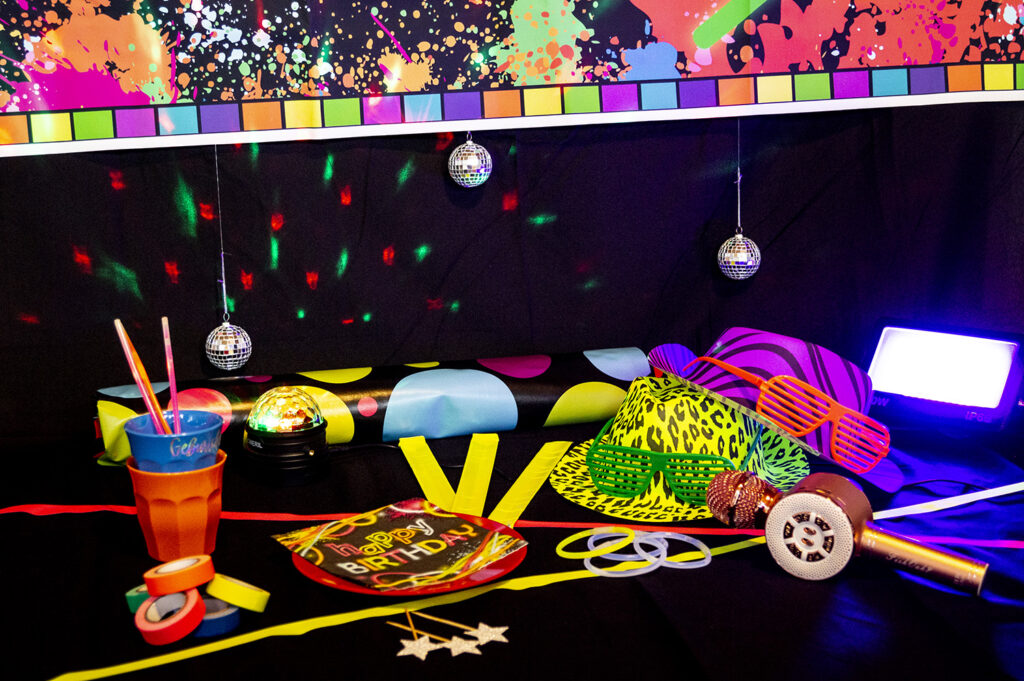 • Deko: Discokugeln zum aufhängen, Servietten, Neon-Luftballons, abwischbare Tischdecke, Glow Crazy Banner-Hintergrund, UV-Strahler/Schwarzlicht, LED-Discokugel mit Lichteffekten, Tischglocke, kleine Schiefertafel zum individuellen Beschriften inkl. Kreidetafelstift