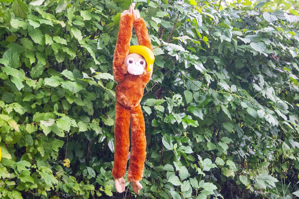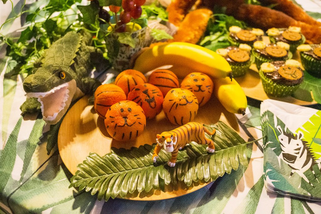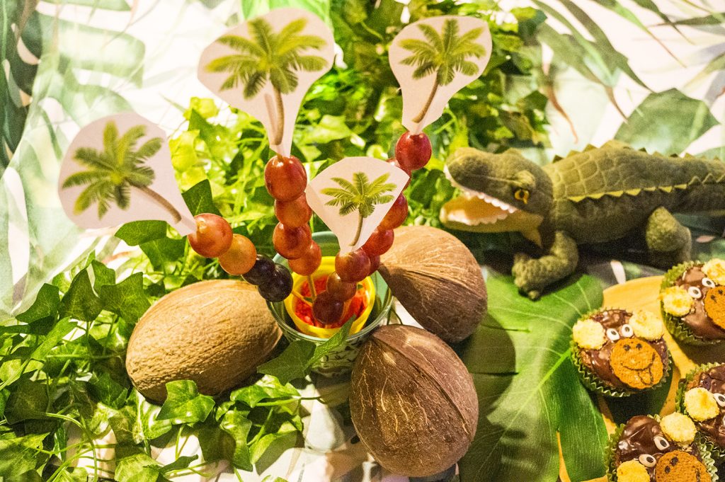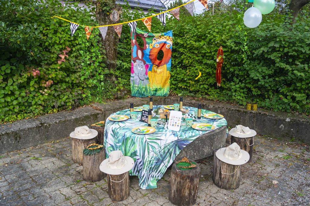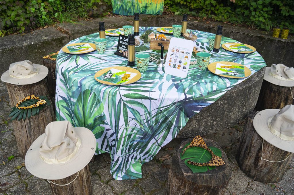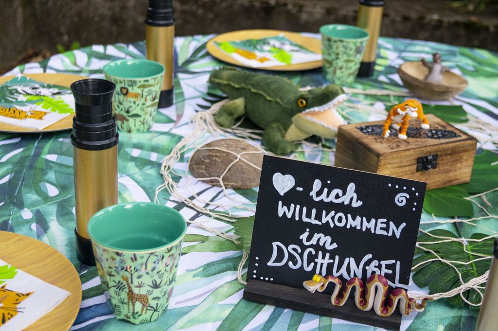 - Deko: diverse Dschungeltiere aus Kunststoff, Servietten, Stoff-Wimpelkette, Deko-Blätter für den Tisch, Kunstoff-Bananen, Stoff-Hängeaffe, Stoff-Krokodil, Hängegirlande Tropische Pflanzen, abwischbare Tischdecke, Tischglocke, kleine Schiefertafel zum individuellen Beschriften inkl. Kreidetafelstift