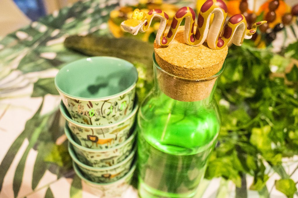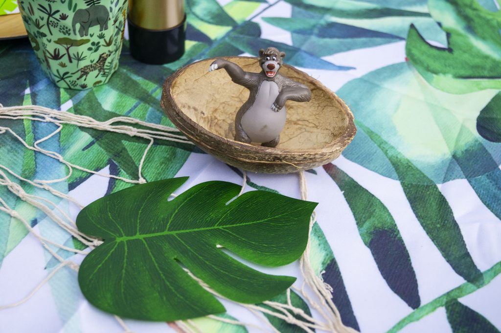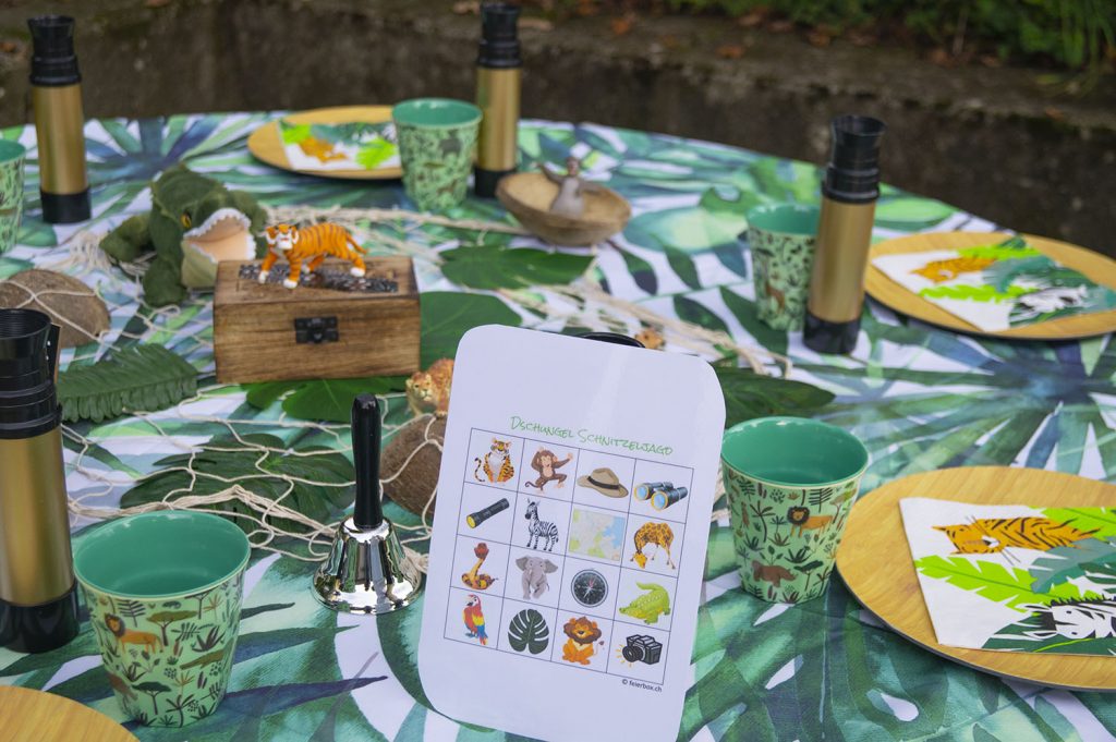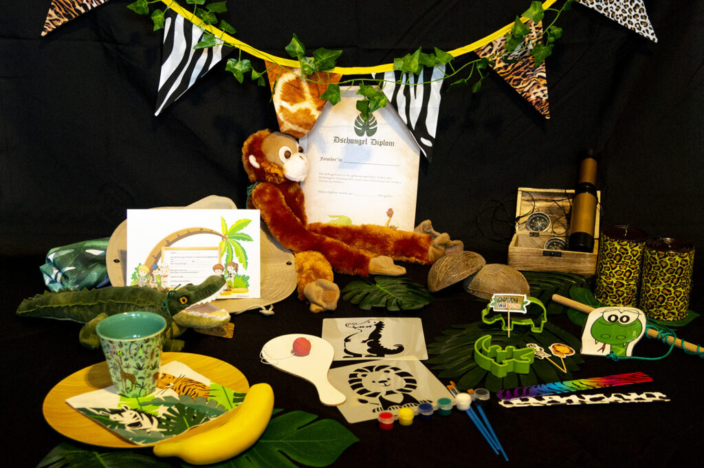 - Spielutensilien: Sackhüpfen, Dschungel Wurf-Spiel (ebenfalls als Dekohintergrund zu verwenden), Schlangen-Aufrollspiel, Dschungel-Schnitzeljagd, Büchsen-Telefon, Schatztruhe