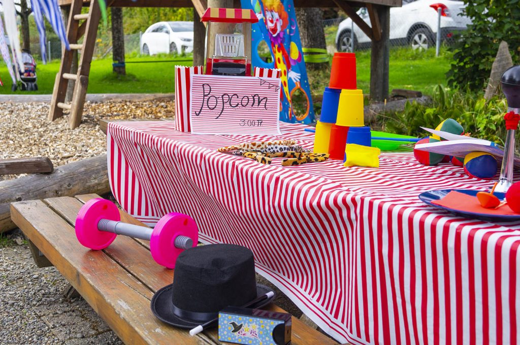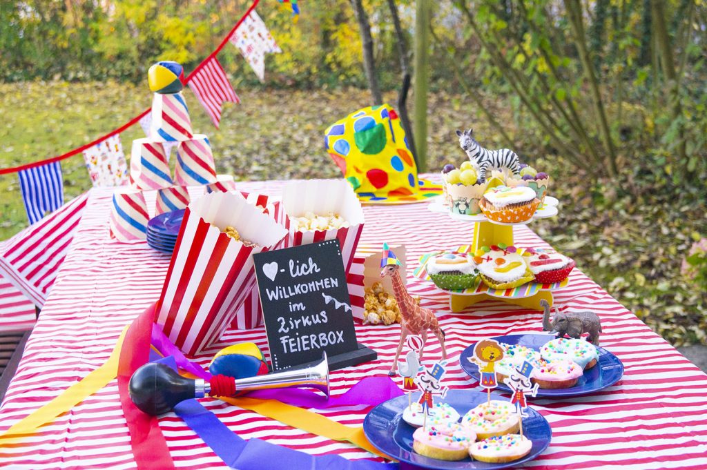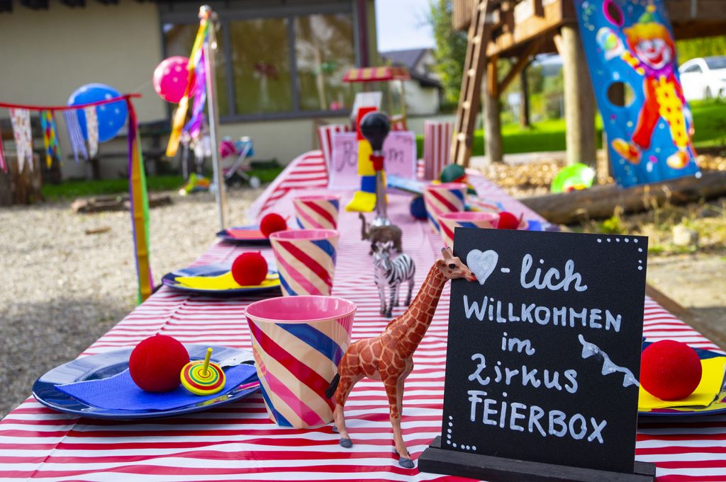- Deko: Servietten, Luftballons, Zirkus-Wimpelkette, abwischbare Tischdecke, diverse Kunstofftiere (Giraffe, Elefant, Löwe etc.) zum Aufstellen, kleine Schiefertafel zum individuellen Beschriften, Clown Hintergrund zum aufhängen (ebenfalls ein Wurfspiel), Tisch-Glocke