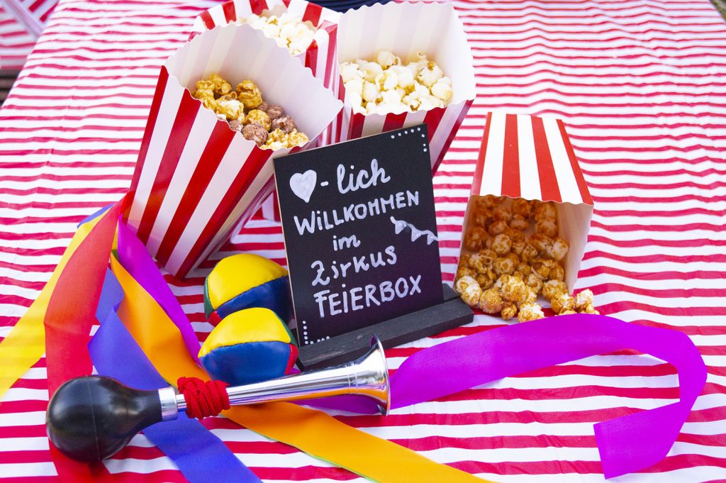 Manege frei und Zirkus-FeierBOX auf! Drinnen findet Ihr alles, was man für eine tolle Zirkusparty braucht. Egal ob Clown*in, Jongleur*in, Raubtierdressur oder Zauberei. Wir haben an alles gedacht!